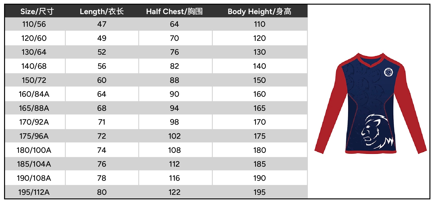 Size 110 or 120 or 130 or 140 or 150 or 160 or 165 or 170 or 175 or 180 or 185 or 190 or 195