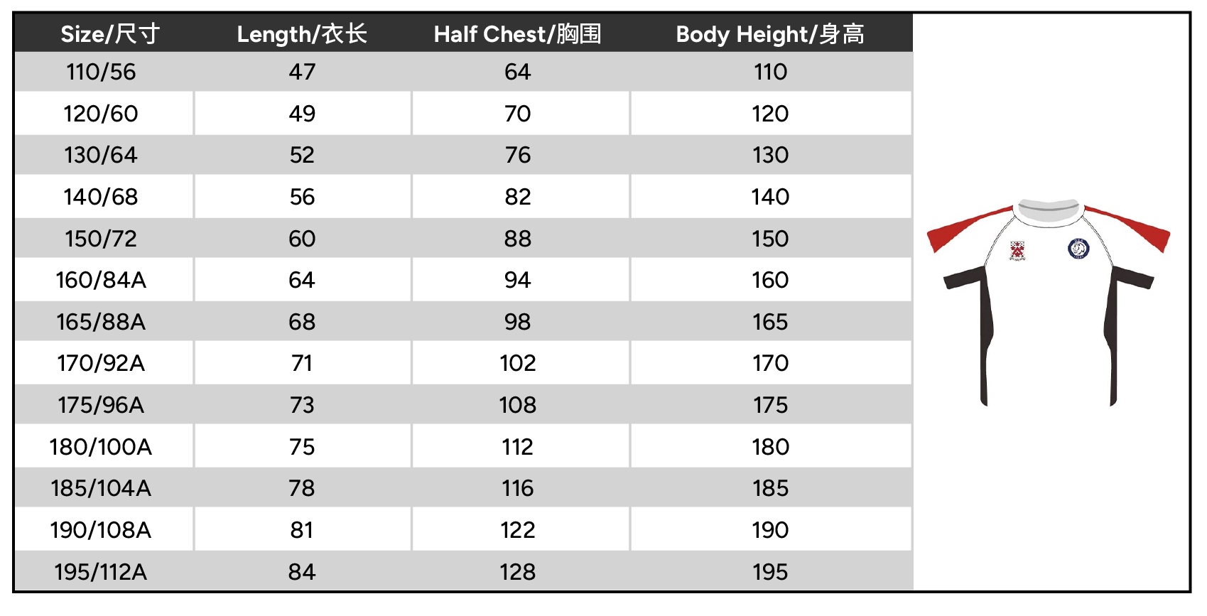 Size 110 or 120 or 130 or 140 or 150 or 160 or 165 or 170 or 175 or 180 or 185 or 190 or 195