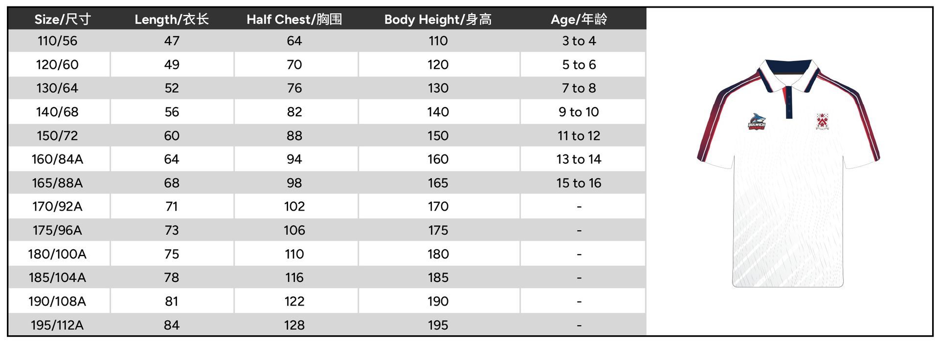 Size 110 or 120 or 130 or 140 or 150 or 160 or 165 or 170 or 175 or 180 or 185 or 190 or 195