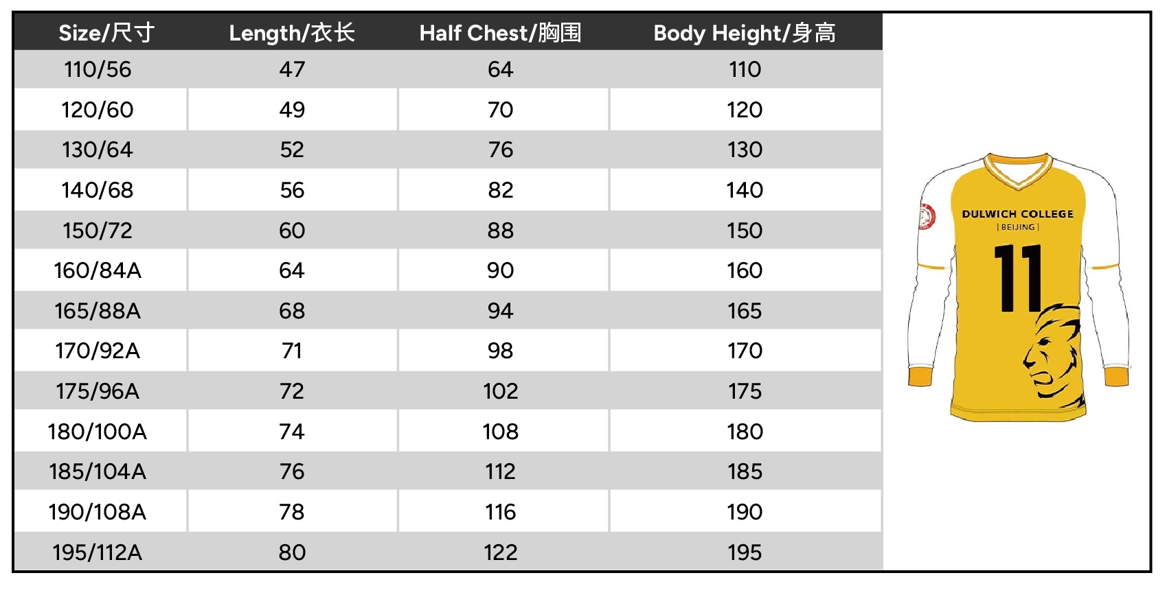 | Size | 110 or 120 or 130 or 140 or 150 or 160 or 165 or 170 or 175 or 180 or 185 or 190 or 195 |