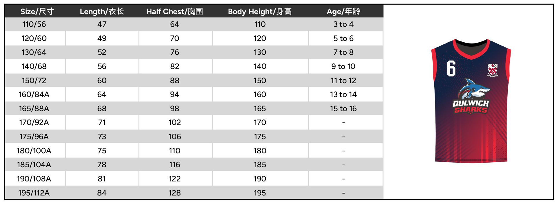 Size 110 or 120 or 130 or 140 or 150 or 160 or 165 or 170 or 175 or 180 or 185 or 190 or 195
