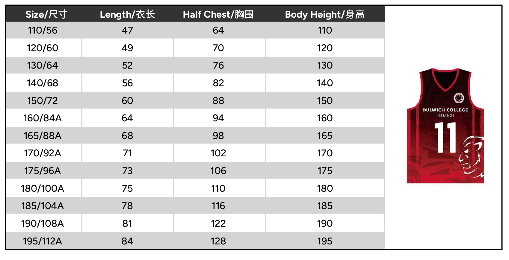 Size 110 or 120 or 130 or 140 or 150 or 160 or 165 or 170 or 175 or 180 or 185 or 190 or 195